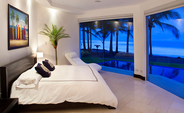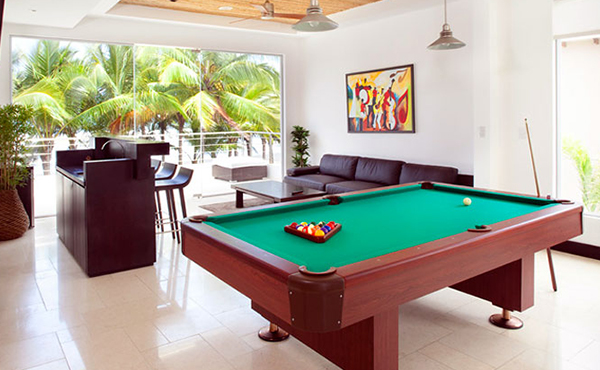 At the Beach Villa, guests can enjoy the tranquil ocean views from the large 2-floor window panes that span the living room and guest suites that overlook the beach. Also on the beach is a large infinity pool where guests can lay back, soak up the sun, and cool off in the water. The second floor of the Beach Villa holds the movie theater, which can accommodate up to ten people. Other forms of entertainment include the game room with pool table and bar.