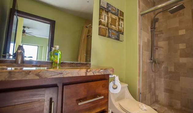 Upon entering the penthouse, you will immediately be drawn in by the endless sparkling Pacific Ocean view from the cathedral ceiling to floor windows. This is how your great vacation begins! The spacious great room promotes luxurious living with ample designer seating, a large flat screen TV and recessed accent lighting in keeping with the upscale and extravagant features of this condominium. The adjacent ocean view dining area offers generous seating for your guests and friends encouraging in-house dining, socializing and entertaining. Sliding glass doors from the great room and dining area feature a balcony that runs the length of the main living area. This is a great area to enjoy the tropical sea breeze, begin your day with a cup of delicious Costa Rican coffee or toast to a fabulous sunset for which the area is well known. The huge kitchen is a chef’s dream with top of the line highly appointed appliances, custom hardwood cabinetry, granite counter tops, walk-in pantry and granite breakfast bar. We have culinary connections and will gladly arrange chef services. Let us know what you desire for your perfect vacation and we will make it come true! The open layout of the condominium’s gourmet kitchen, dining area, and great room offers a spacious area for a large gathering with friends, families, or bachelor/bachelorette parties and assures a memorable vacation. Tropical ceiling fans and high energy, air conditioning are featured throughout the condo for your comfort.